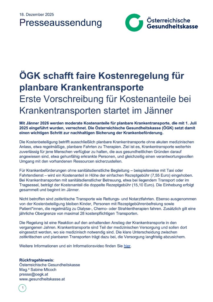 ÖGK schafft faire Kostenregelung für planbare Krankentransporte